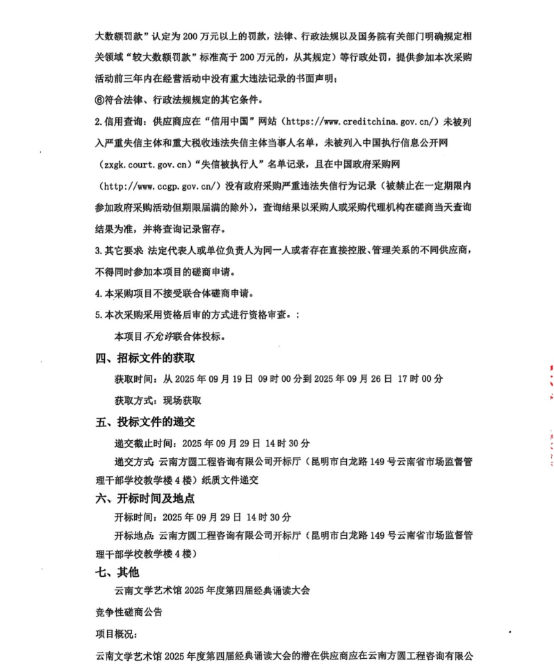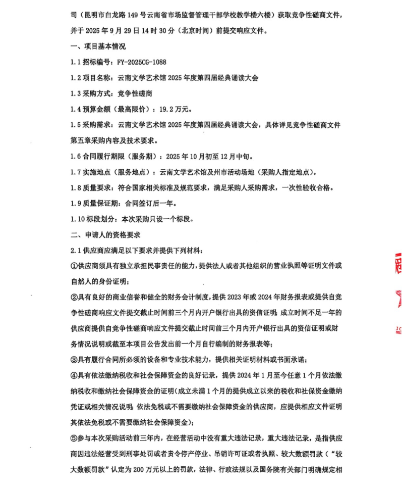 云南文学艺术馆2025年度第四届经典诵读大会竞争性磋商公告