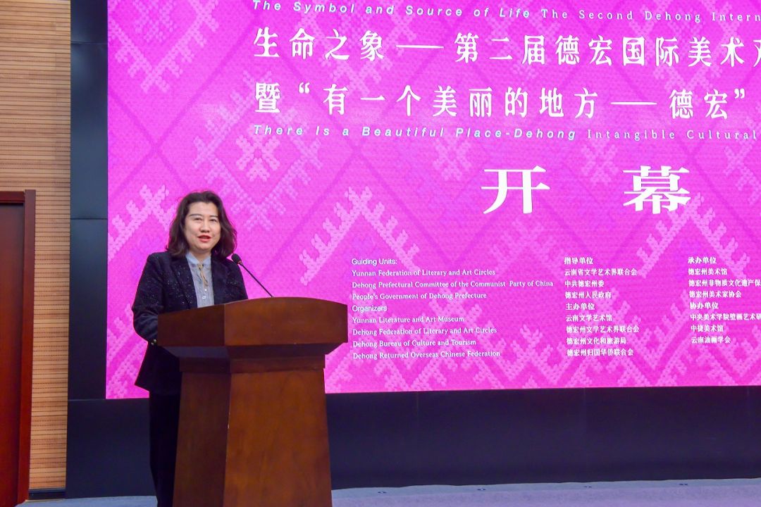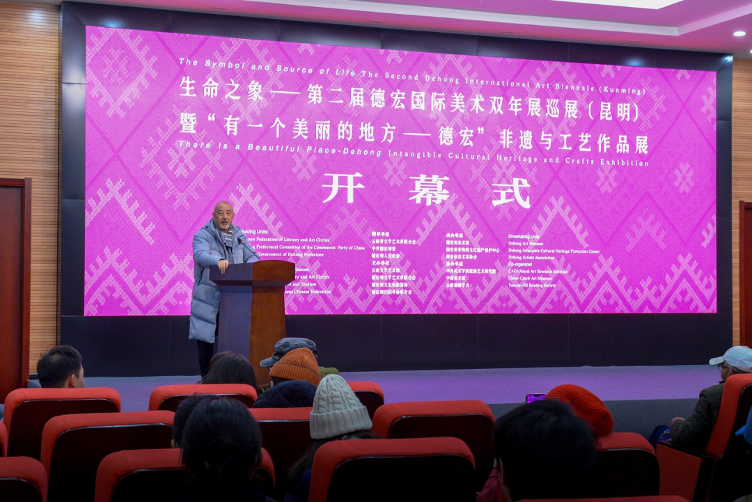 2025年1月10日,随着新春佳节的脚步日益临近,“生命之象—第二届德宏国际美术双年展”巡展(昆明)暨“有一个美丽的地方—德宏”非遗与工艺作品展在云南文学艺术馆成功举行开幕式。此次展览由云南省文学艺术界联合会、中共德宏州委、德宏州人民政府共同指导,云南文学艺术馆主办。云南油画学会会长唐志冈、德宏州美术家协会主席杨小华出席开幕式,云南文学艺术馆馆长黑燕宣布展览开幕。
